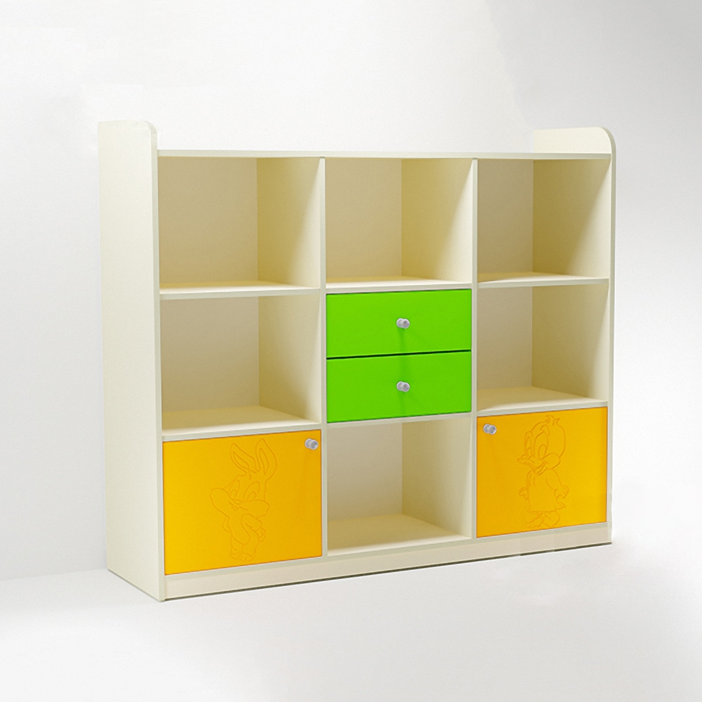 У него компактный размер, что позволяет разместить его в небольших помещениях. Имеются открытые полки для хранения вещей или игрушек. В закрытые шкафчики можно положить полотенца или постельное белье, чтобы на них не оседала пыль. Есть выдвижные ящики, куда поместятся небольшие предметы. На дверцах шкафов фрезой нанесен рисунок персонажей из мультфильмов. Это делает стенку визуально приятной для восприятия ребенком.