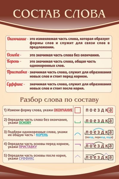 В русском языке слово состоит не только из корня и окончания, существуют и другие элементы, которые бывает не легко запомнить и разобрать ученику. Поэтому ни один кабинет русского языка в школах не должен обходиться без стенда «Состав слова», в котором говорится о том, что такое состав слова, и подробно разбирается несколько слов по составу, выделяя их яркими цветами. Преподаватель сможет применять такой стенд как наглядное учебное пособие для учеников, а современное оформление придаст кабинету эстетичность. Стенд изготовлен из качественного ПВХ и крепится с помощью скотча или саморезов.